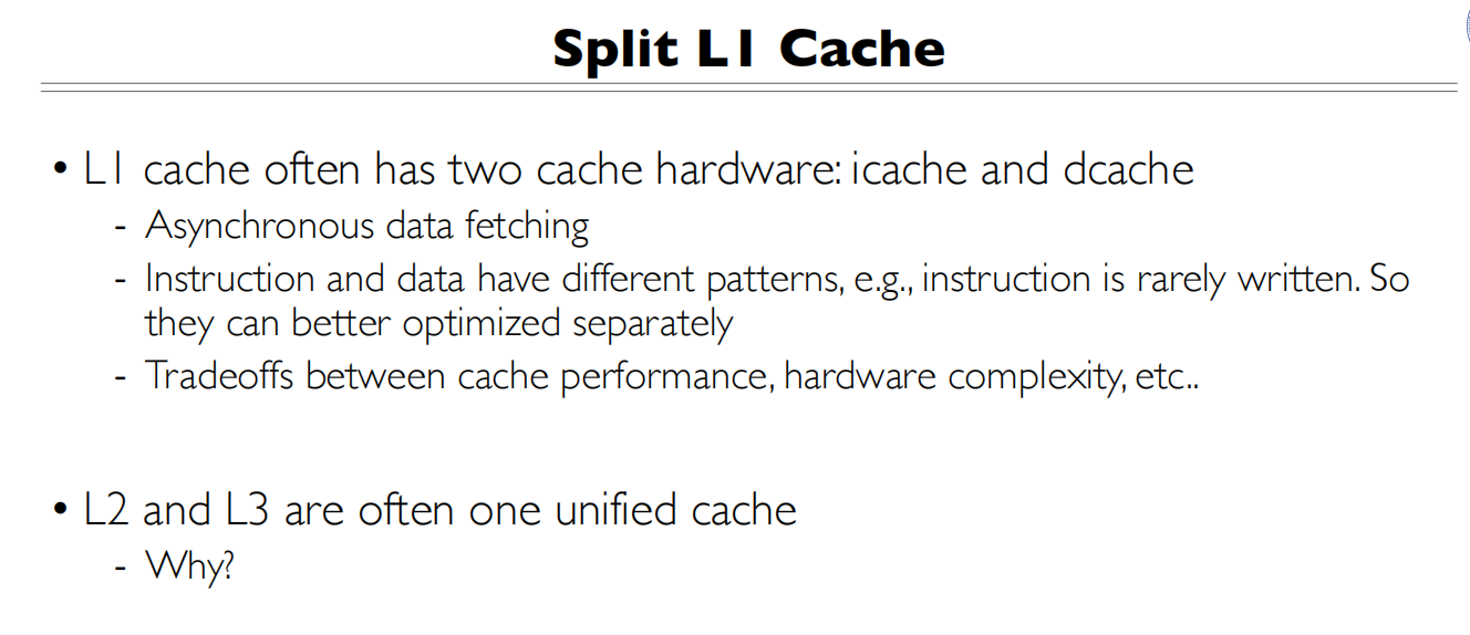 L1 Cache会区分指令和数据的Cache,因为L1 Cache是在CPU内的
