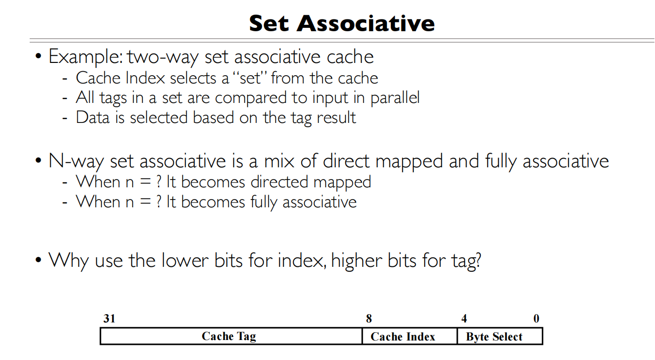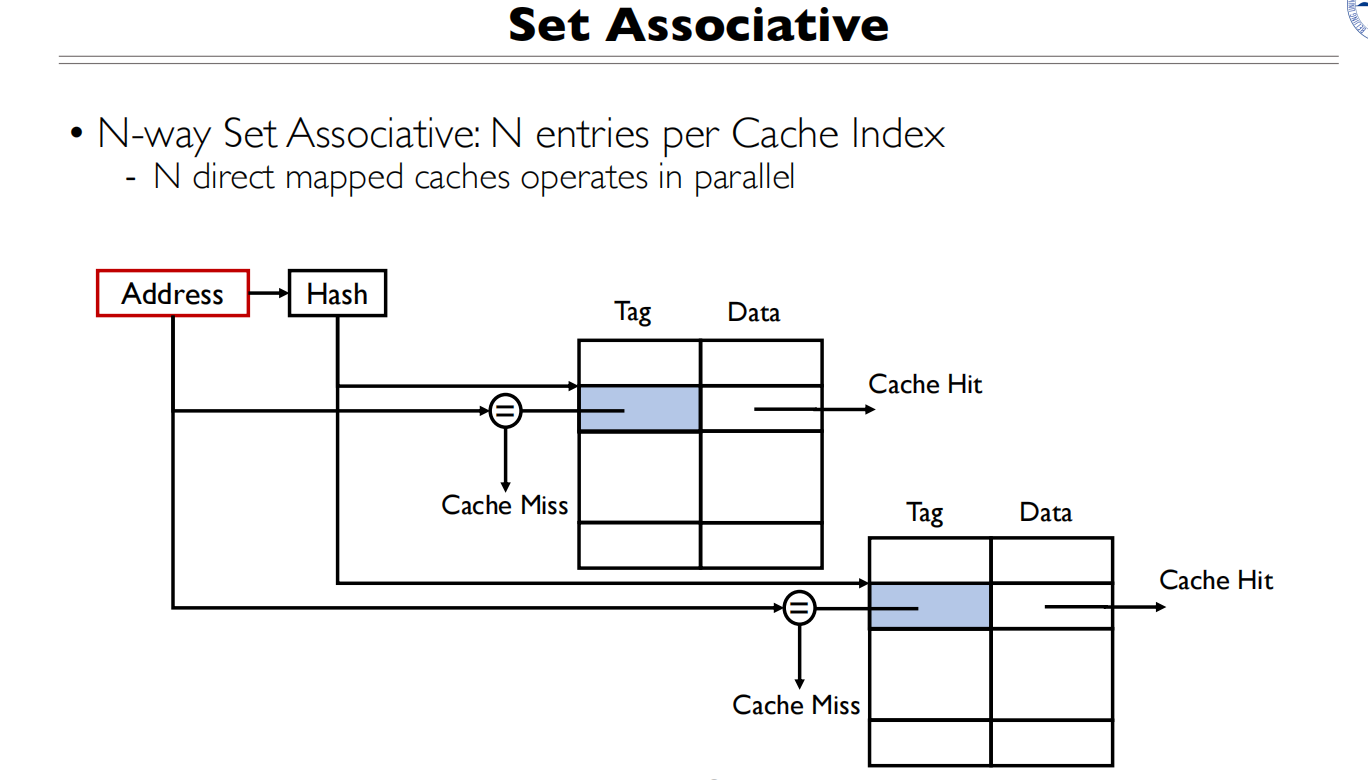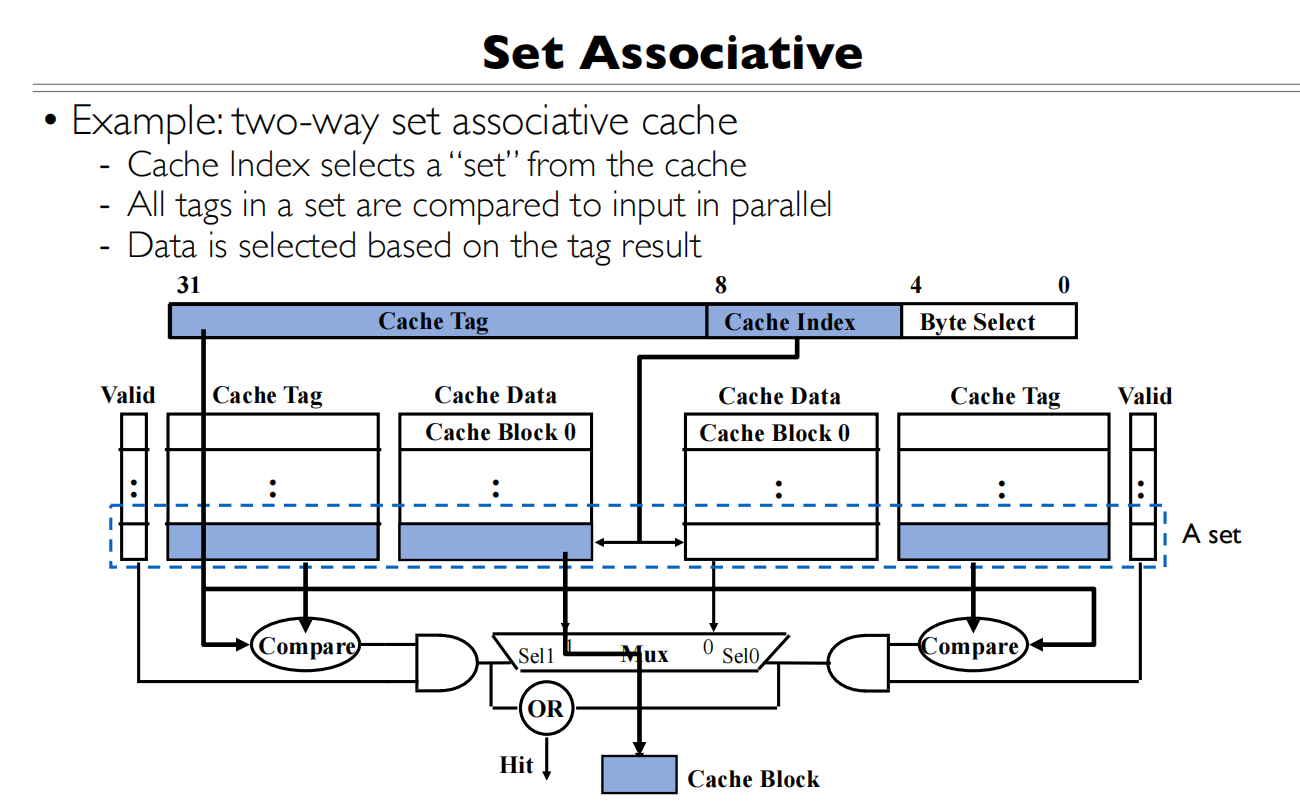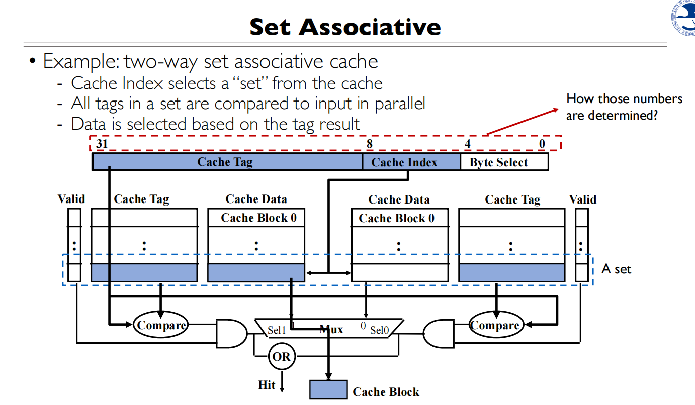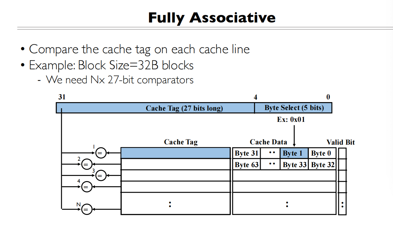 - Tag部分与所有Cache行的Tag同时比较(图中的N个比较器)