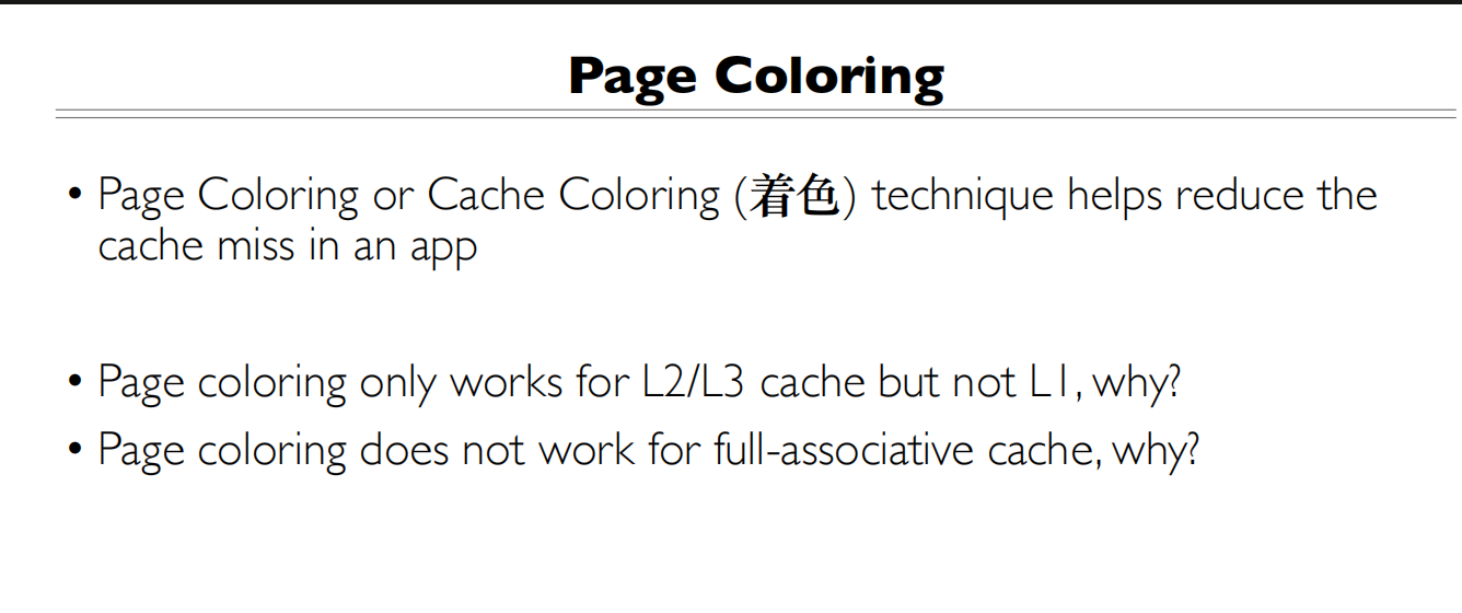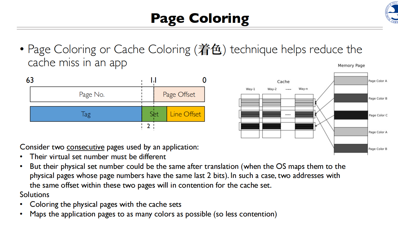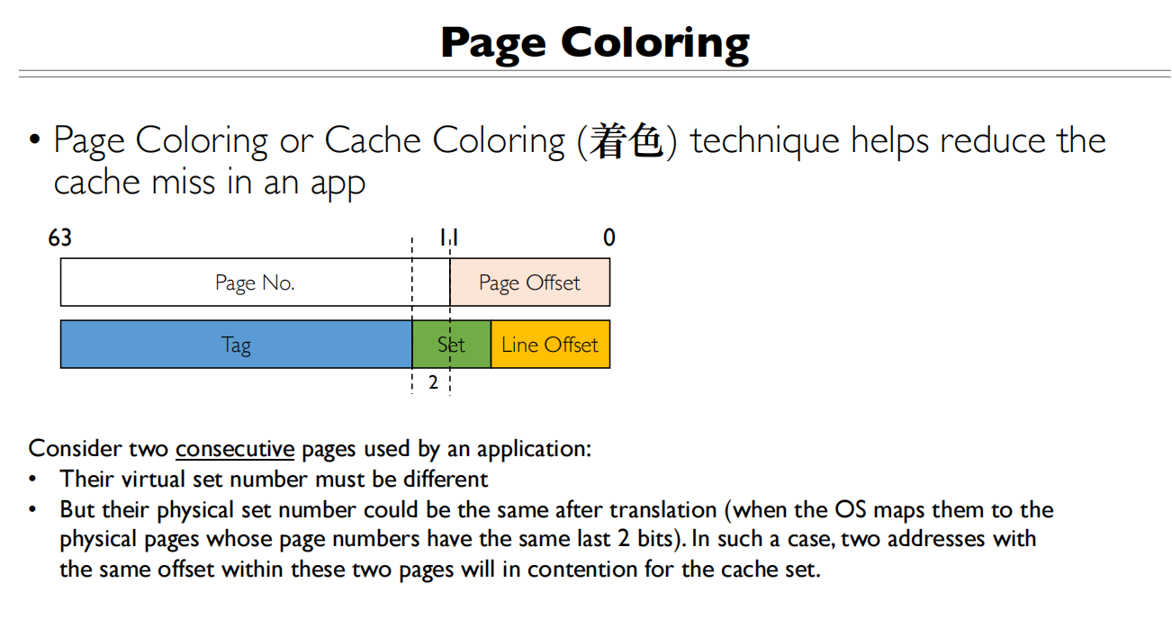 - 页面着色的主要目的是通过控制页面到缓存组的映射来减少缓存冲突