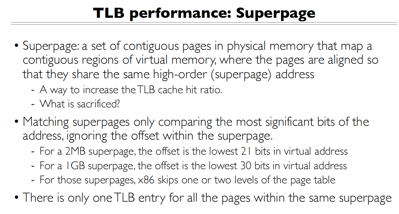 - 2MB超页:只需要512个TLB表项