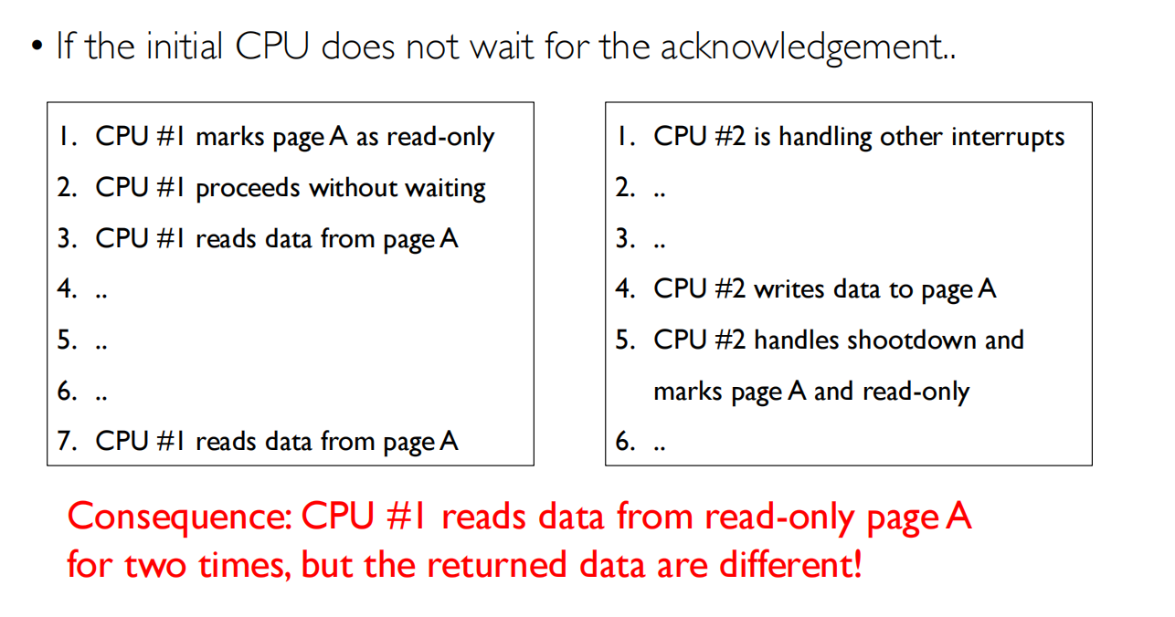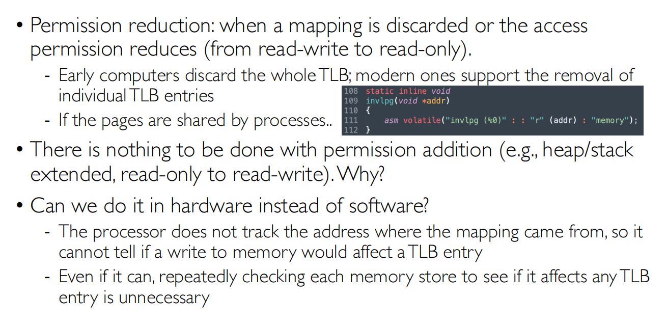 当权限提高的时候不需要立刻修改TLB,因为当TLB存在问题就会去查页表,然后再更新TLB “lazy design”