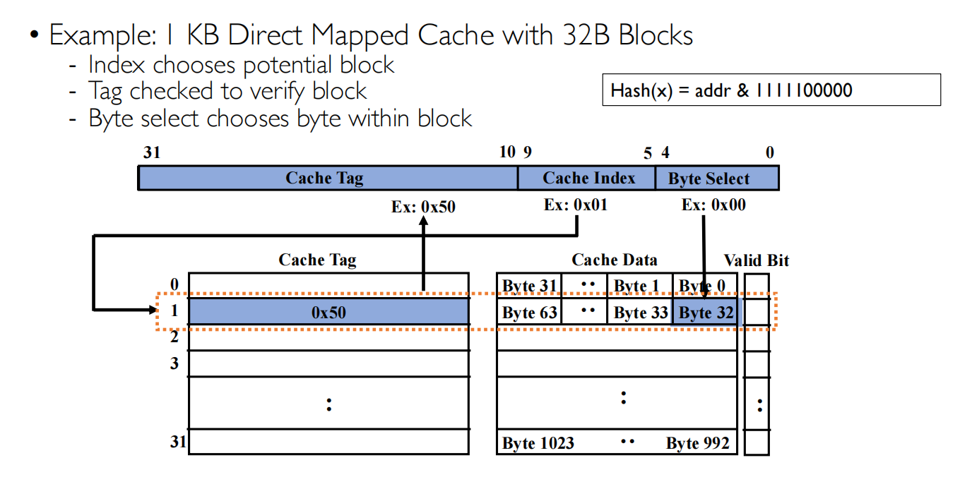 一个Cache block 是32bytes,将地址分为两部分Cache Tag(27 bits)+Byte Select(5 bits)