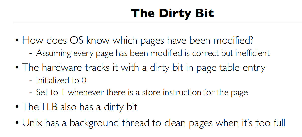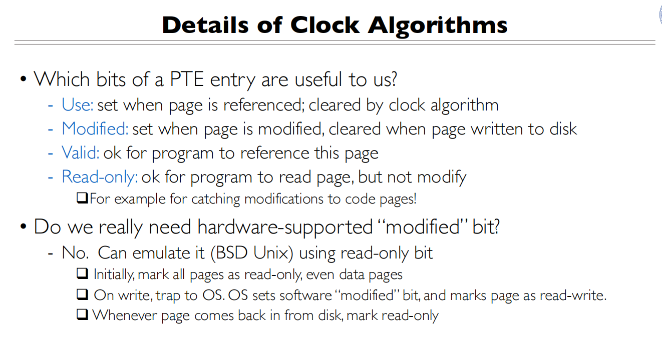 - CPU:memory management (MMU), a few bits in page table entry, etc