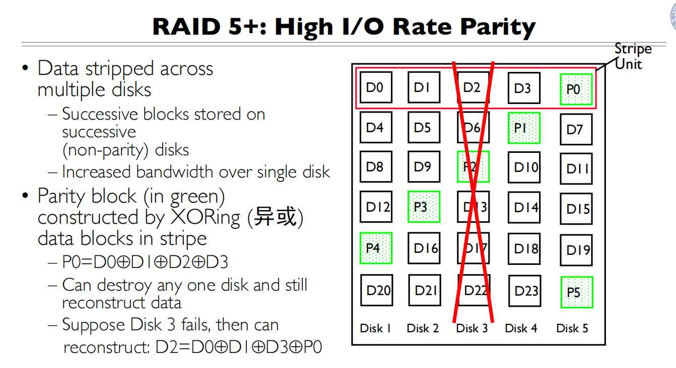 - 当任何一块磁盘损坏时,可以通过其他数据块和校验块重建数据 例如:如果D2损坏,可以通过 D2 = D0 ⊕ D1 ⊕ D3 ⊕ P0 恢复